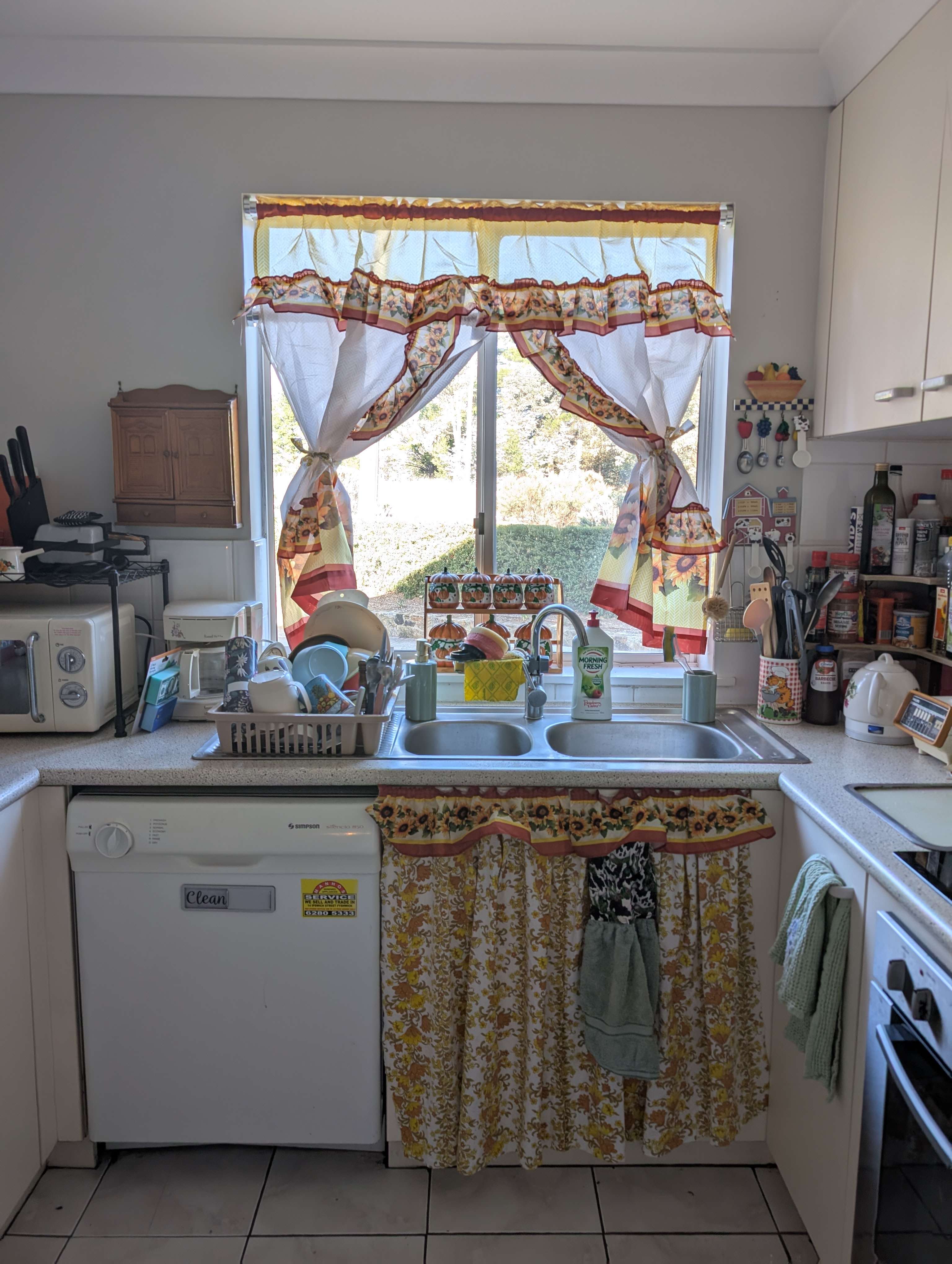 This photo is a bit old but I wanted to share the curtains I made for my kitchen cabinets ! They're made out of a vintage sheet I'd gotten from the charity shop which has provided a bounty of fabric for various projects, including a headband, a watchband, an apron, and these curtains. I find vintage sheets the perfect fabric supply because they have groovy patterns, don't contribute to the consumption of buying new, and are much more affordable per square metre. The curtains look a little wonky in the picture (which they are, a little !), but I like the imperfection, and the fabric goes so well with my window curtains. I used a bit of extra trim from the window ones (which I didn't make myself) to make a trim for the sink ones.