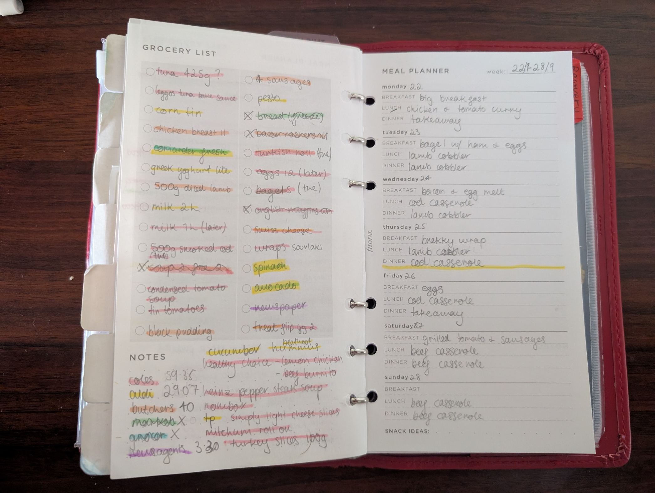 This week's shopping list is a little chaotic, but I've been finding my Filofax meal planning and shopping list templates very handy. The only problem is that they start on a Monday and I start my meal plans on a Friday so I have to split them over two sheets. I'm thinking of just renaming the days to make it even. Here's this week's (22-28 September 2025) plan: